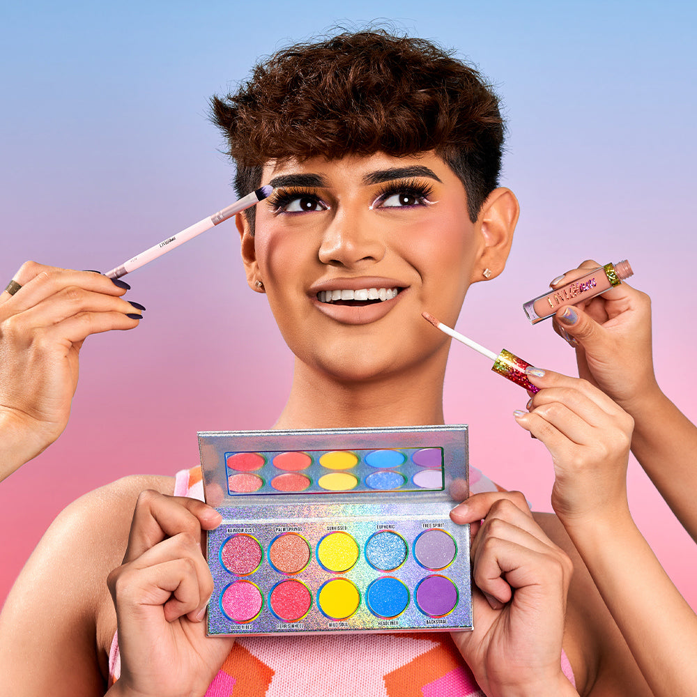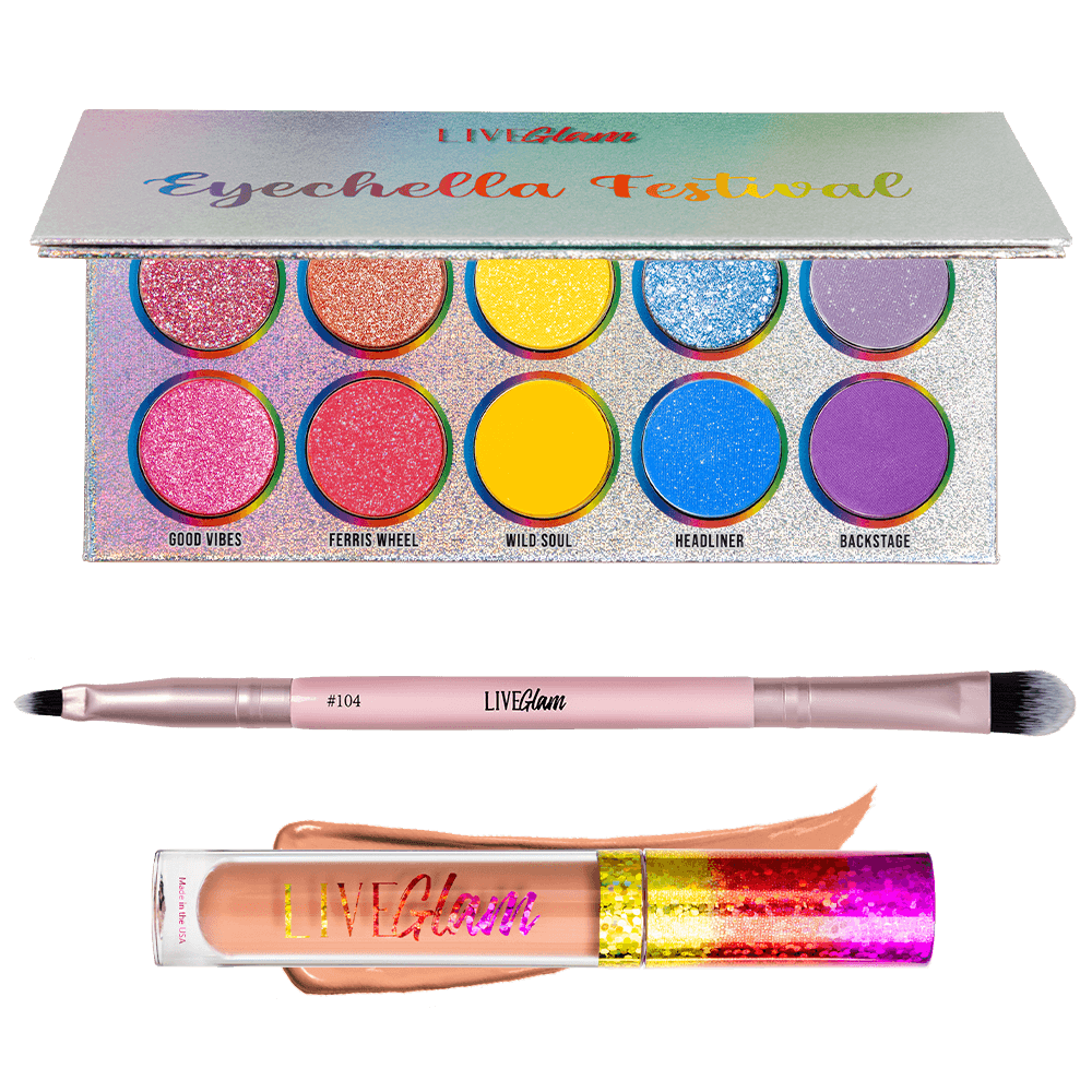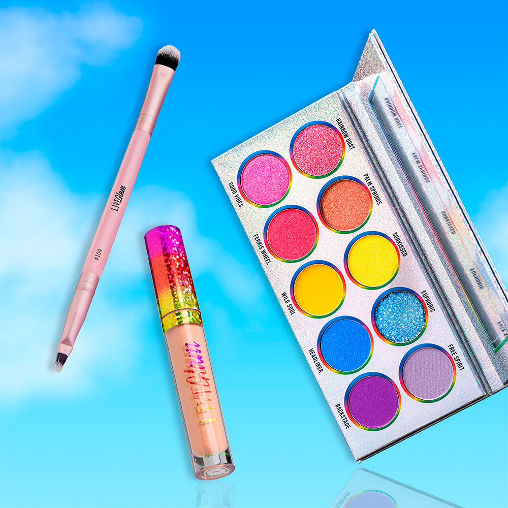 It’s time to let the good vibes roll and broaden your makeup horizon with our collection, Festival Faves. With a vibrant rainbow palette, a duo eye brush, and the perfect nude lippie, these products will be your glow-to accessories for summer festival season.