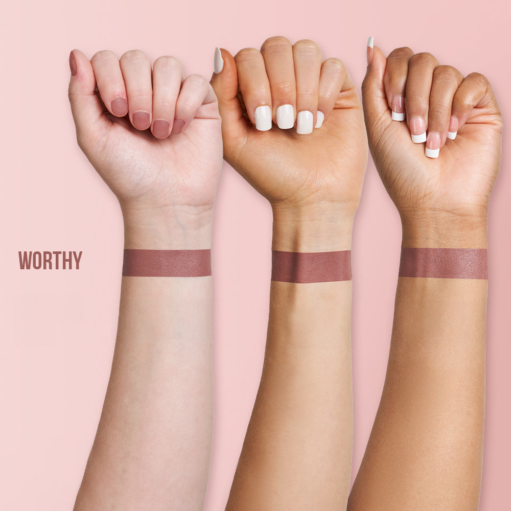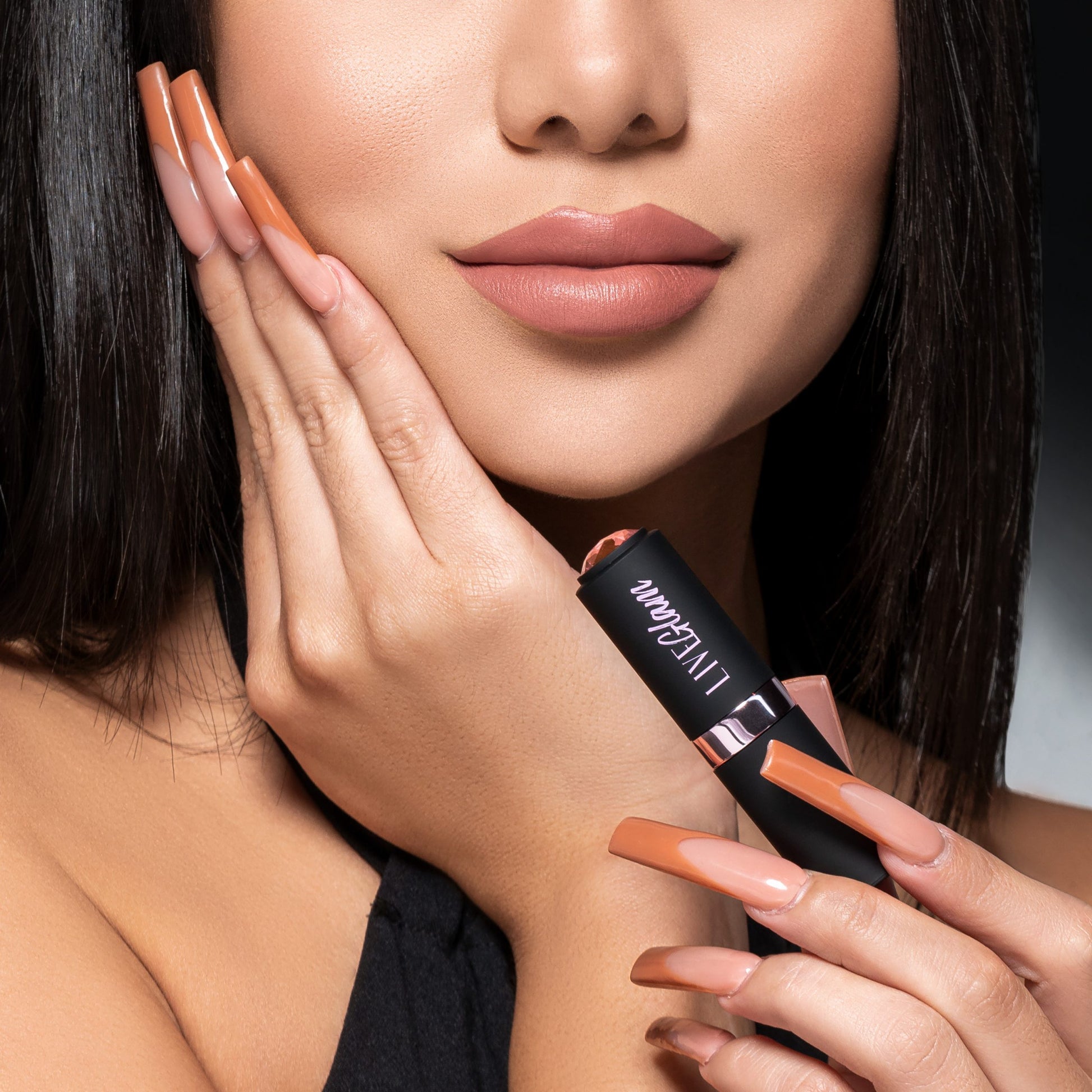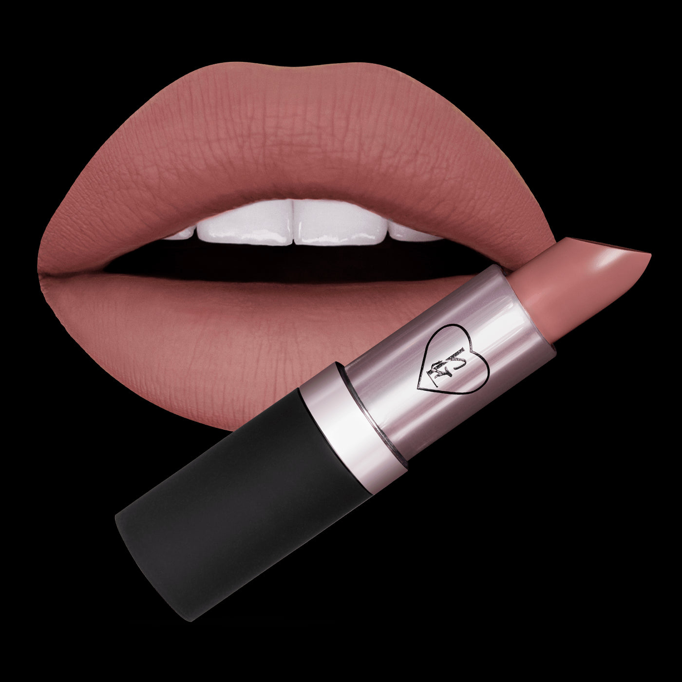 Say a toast and get glowing with this creamy, long-wearing deep pinky nude lipstick bullet!